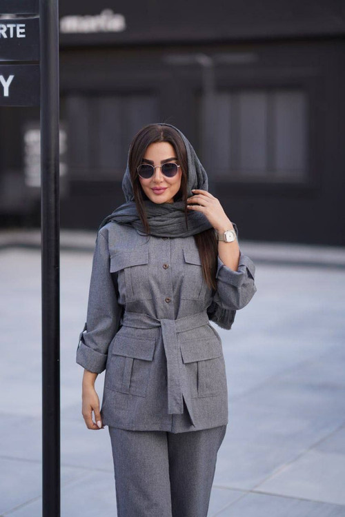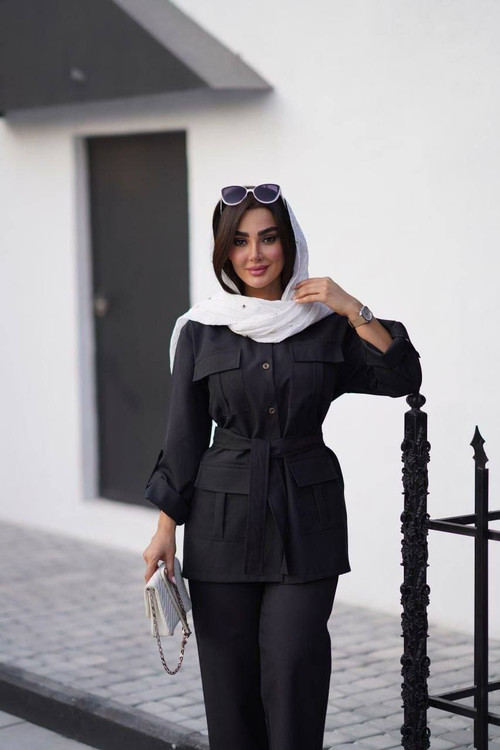 ✅قداستین۵۷✅ دوربازو۴۵ ✅دورسینه110 ✅قدشلوار۹۰ ✅دورران60✅دمپا۴۰ پشت کمر شلوار کش خورده